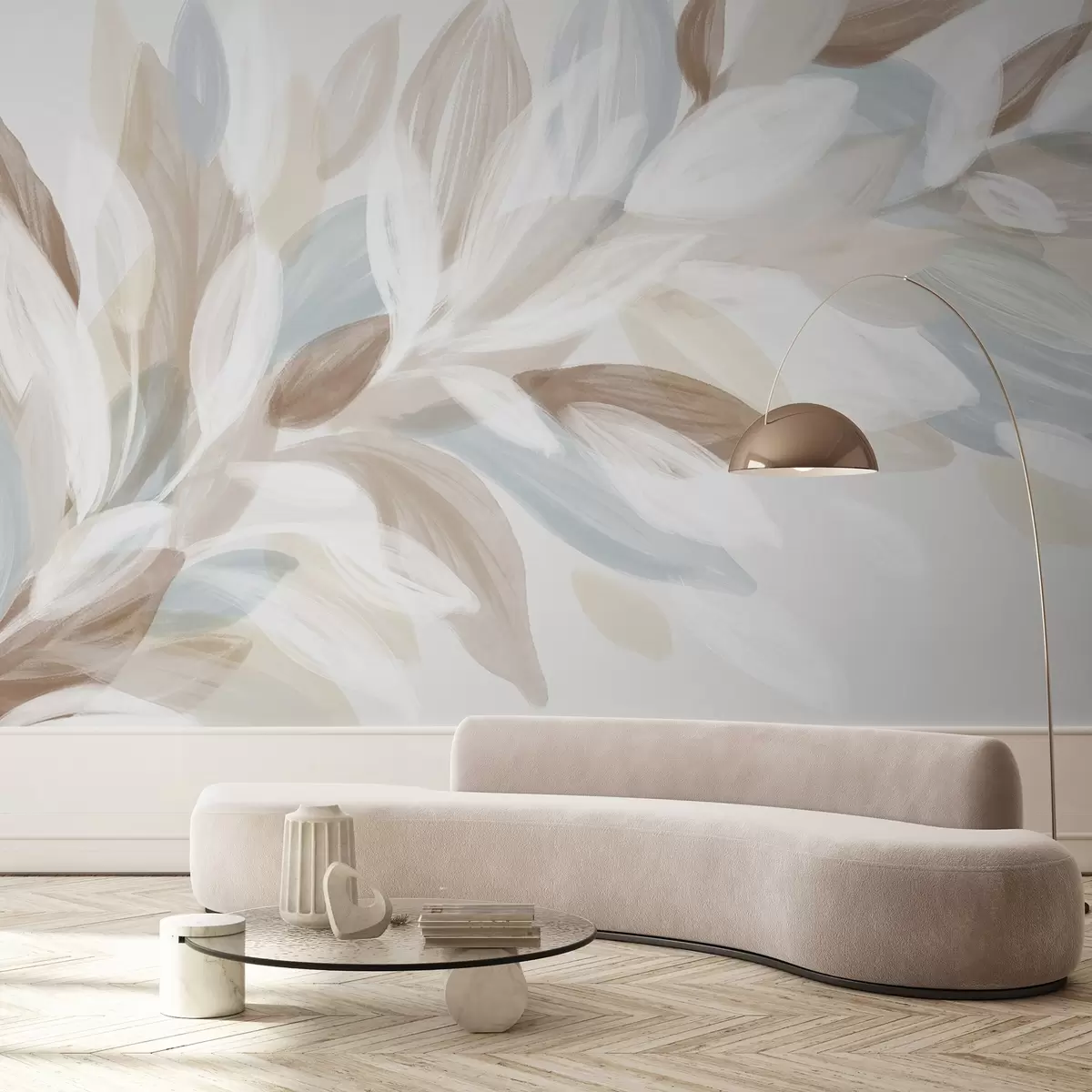 Fototapeten Weiche, pastellfarbene Blätter in Weiß-, Beige- und Hellblautönen, die eine zarte und ätherische Komposition ergeben N° w08649