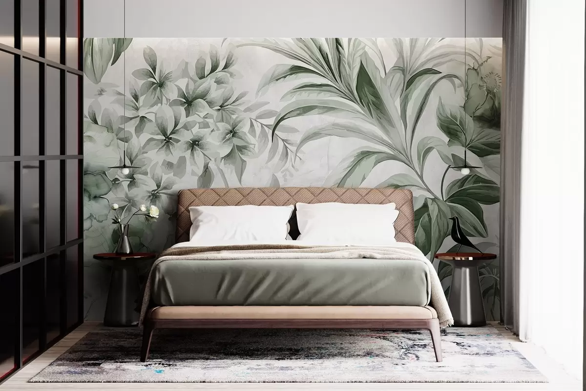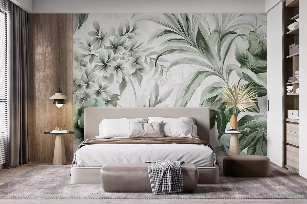Fototapeten Tropische Blätter und Blattwerk in einer gedämpften Palette von hellen bis dunklen Grüntönen auf strukturiertem hellem Hintergrund N° w08650