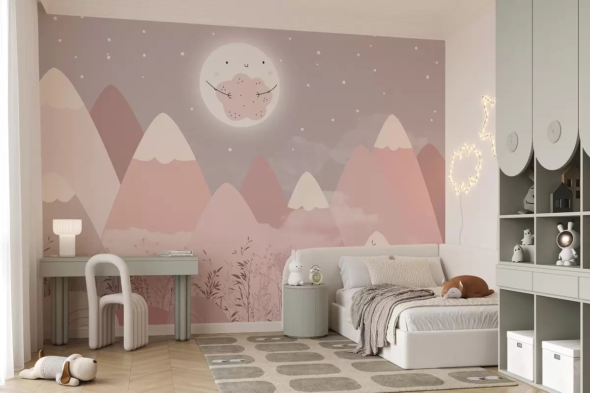 Fototapeten Kinderberge mit einem niedlichen Mond und Pflanzen am Boden N° w08659