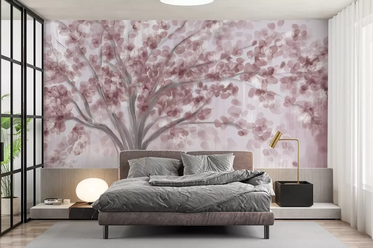 Fototapeten Ein großer Baum mit weichen, abstrakten Blättern in Rosa auf einem hellen, neutralen Hintergrund, der die Farbtöne des Baums hervorhebt N° w08669v2