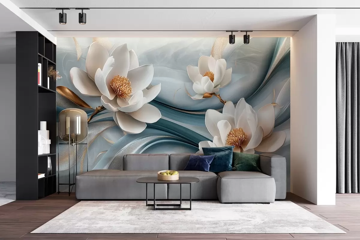 Fototapeten Magnolienblüten kombiniert mit Blau-, Weiß- und Gelbtönen mit abstrakten Wellen N° w08695