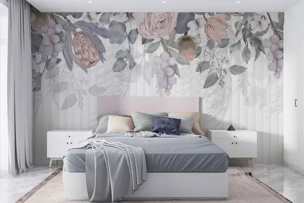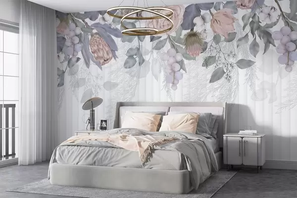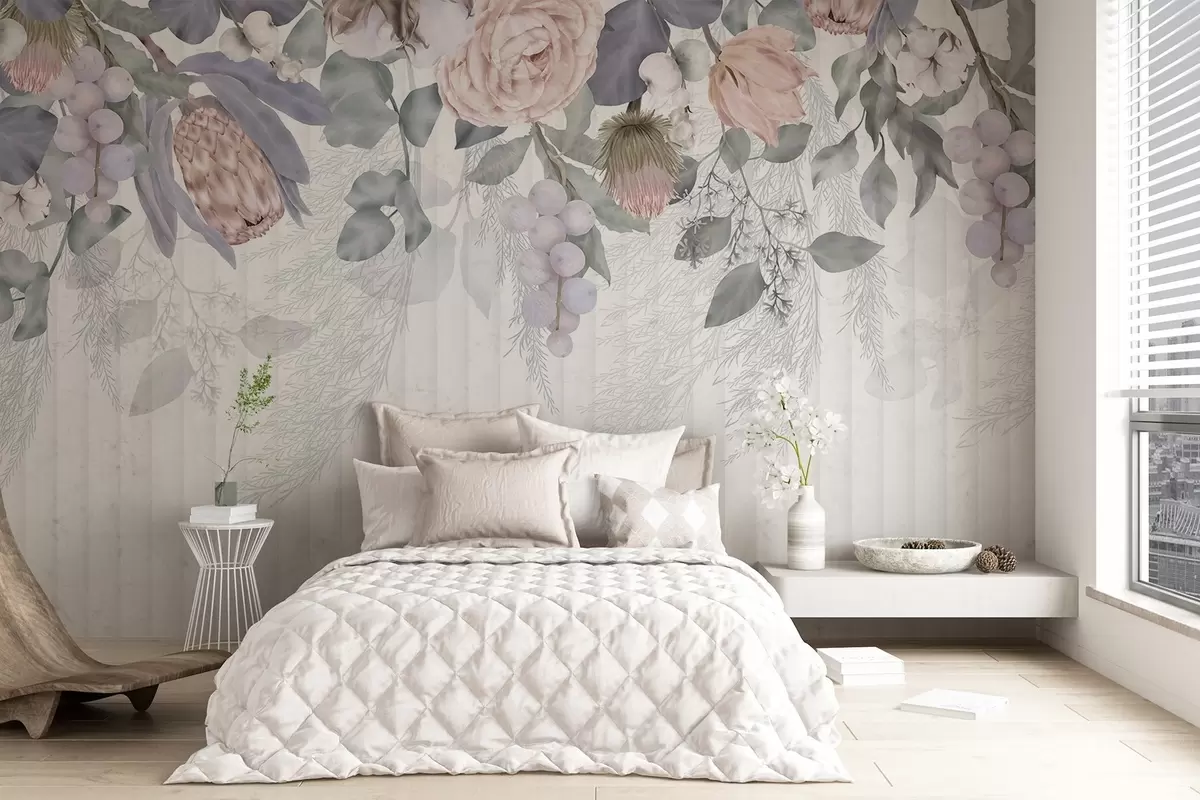Fototapeten Eine florale pastellfarbenen rosa Rosen, Protea Blumen, Eukalyptus-Zweige und Beeren auf strukturierten Hintergrund N° w08700