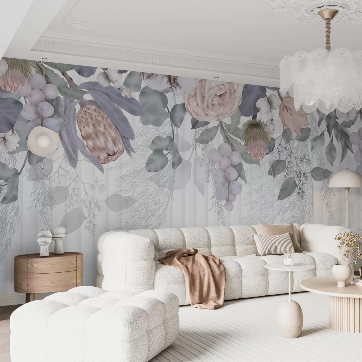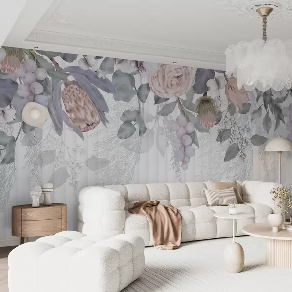 Fototapeten Eine florale pastellfarbenen rosa Rosen, Protea Blumen, Eukalyptus-Zweige und Beeren auf strukturierten Hintergrund N° w08700