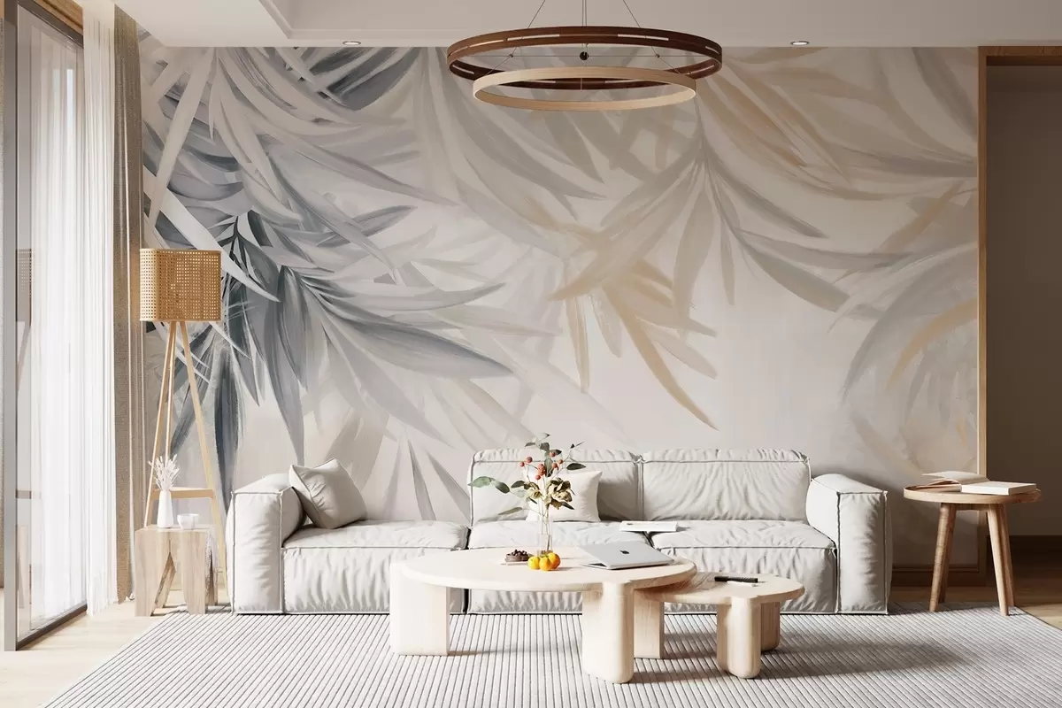 Fototapeten Weiche, fließende, helle tropische Blätter in Grau- und Pfirsichtönen, die in einen hellen, neutralen Druck übergehen N° w08703