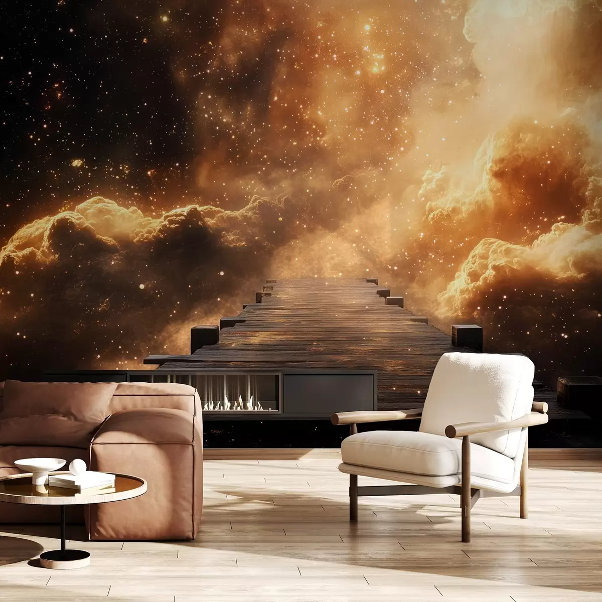 Fototapeten Kosmischer gelb-schwarzer Sternenhimmel mit einem Holzsteg N° w08723