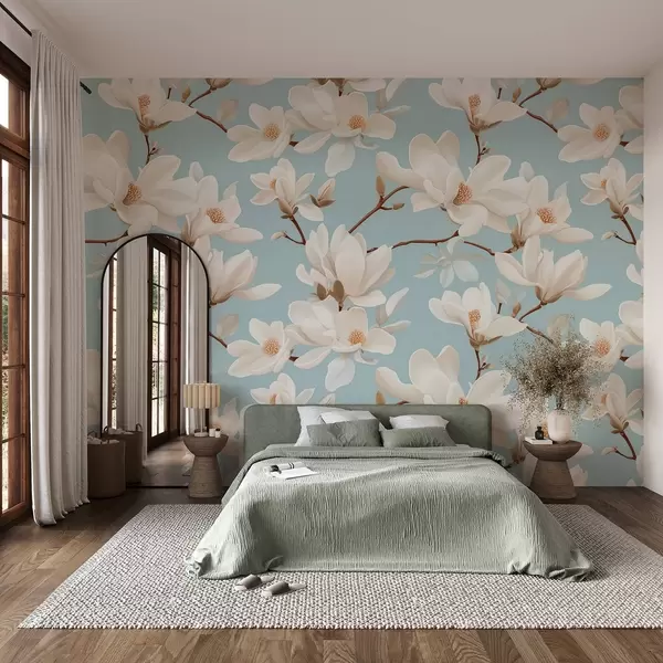 Fototapeten Muster aus weißen Magnolienblüten, pastellblauer Hintergrund, weiße Blätter und Zweige N° w08726