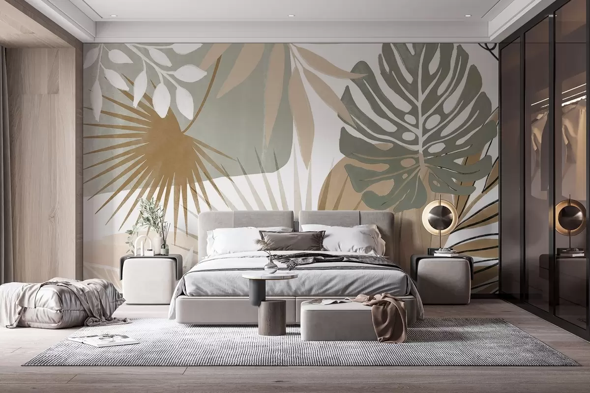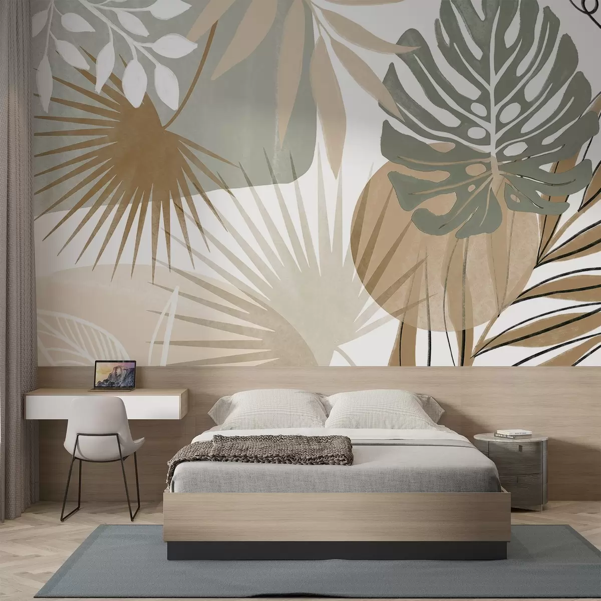 Fototapeten Abstraktes Design mit verschiedenen tropischen Blättern und in erdigen Grün-, Beige- und Cremetönen N° w08738v1