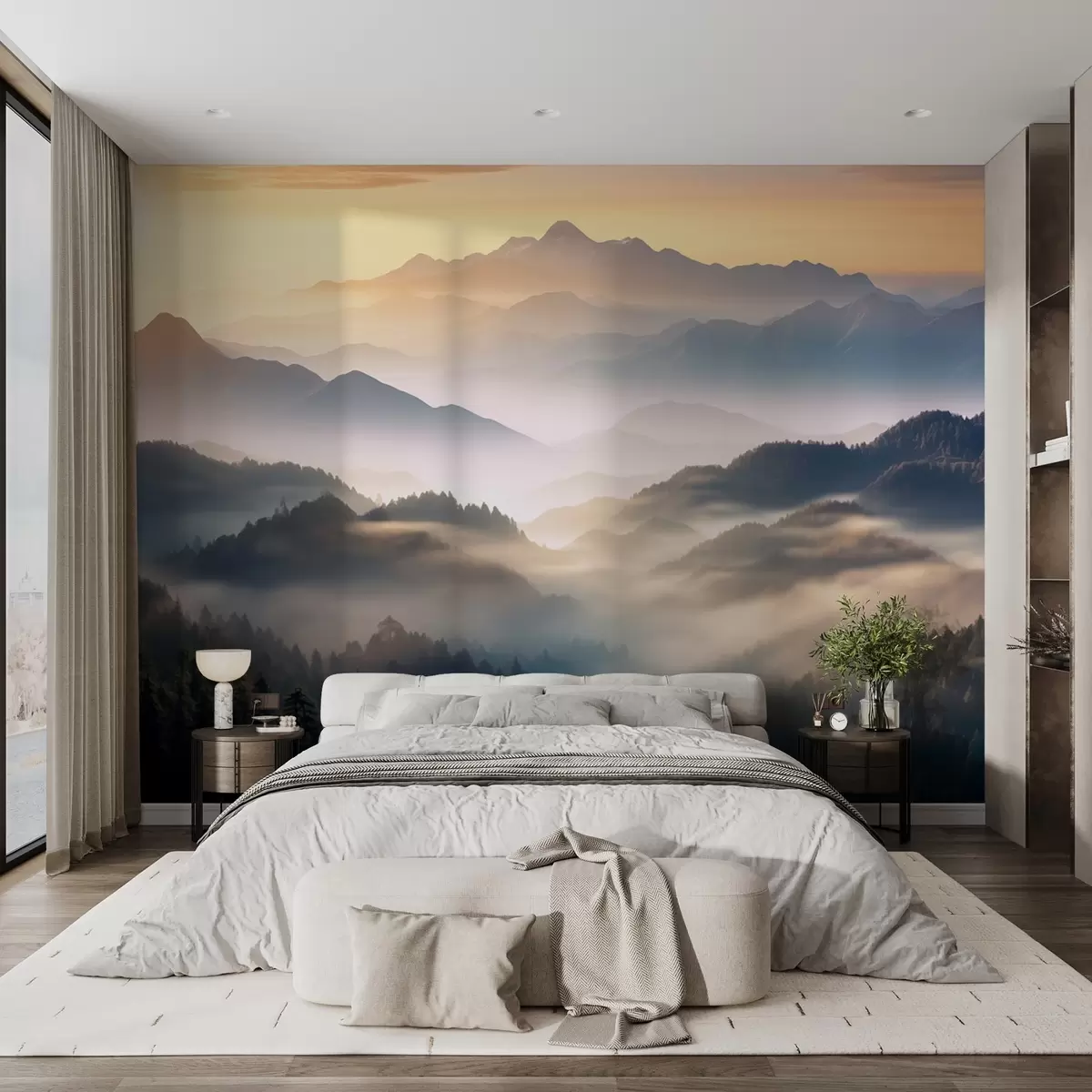 Fototapeten Ruhige Berglandschaft in der Morgendämmerung, mit leichtem Nebel, der die Kiefern umhüllt N° w08748