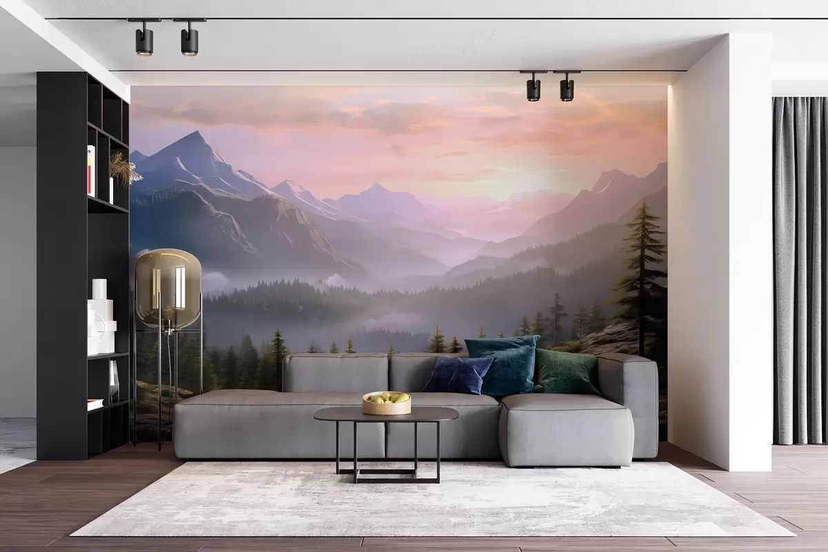 Fototapete Ruhige Berglandschaft in der Morgendämmerung mit leichtem Nebel vor einem Waldhintergrund w08750