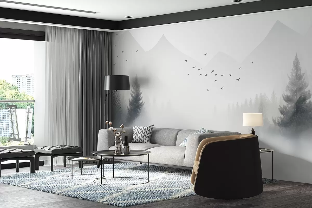 Fototapeten Ruhiger Winterwald an einem Berghang in weißen und hellgrauen Farbtönen N° w08756