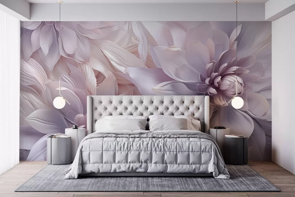 Fototapeten Weiche, geschichtete Blumen in zarten Rosa-, Lavendel- und Weißtönen mit zarten Blütenblättern und verschlungenen Details N° w08783