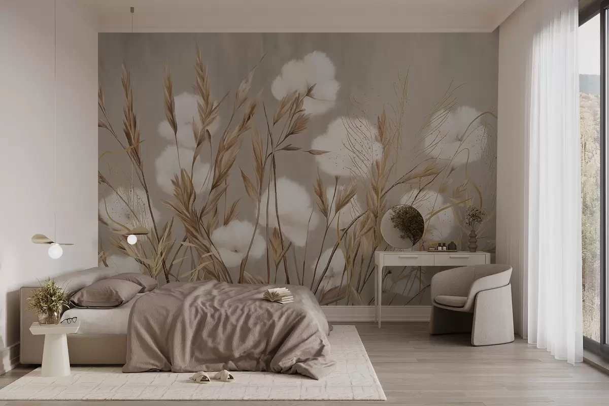 Fototapeten Weiche, flauschige weiße Baumwollblumen und hohe orangefarbene Gräser mit Ähren vor einem gedämpften, strukturierten beigen Hintergrund N° w08784