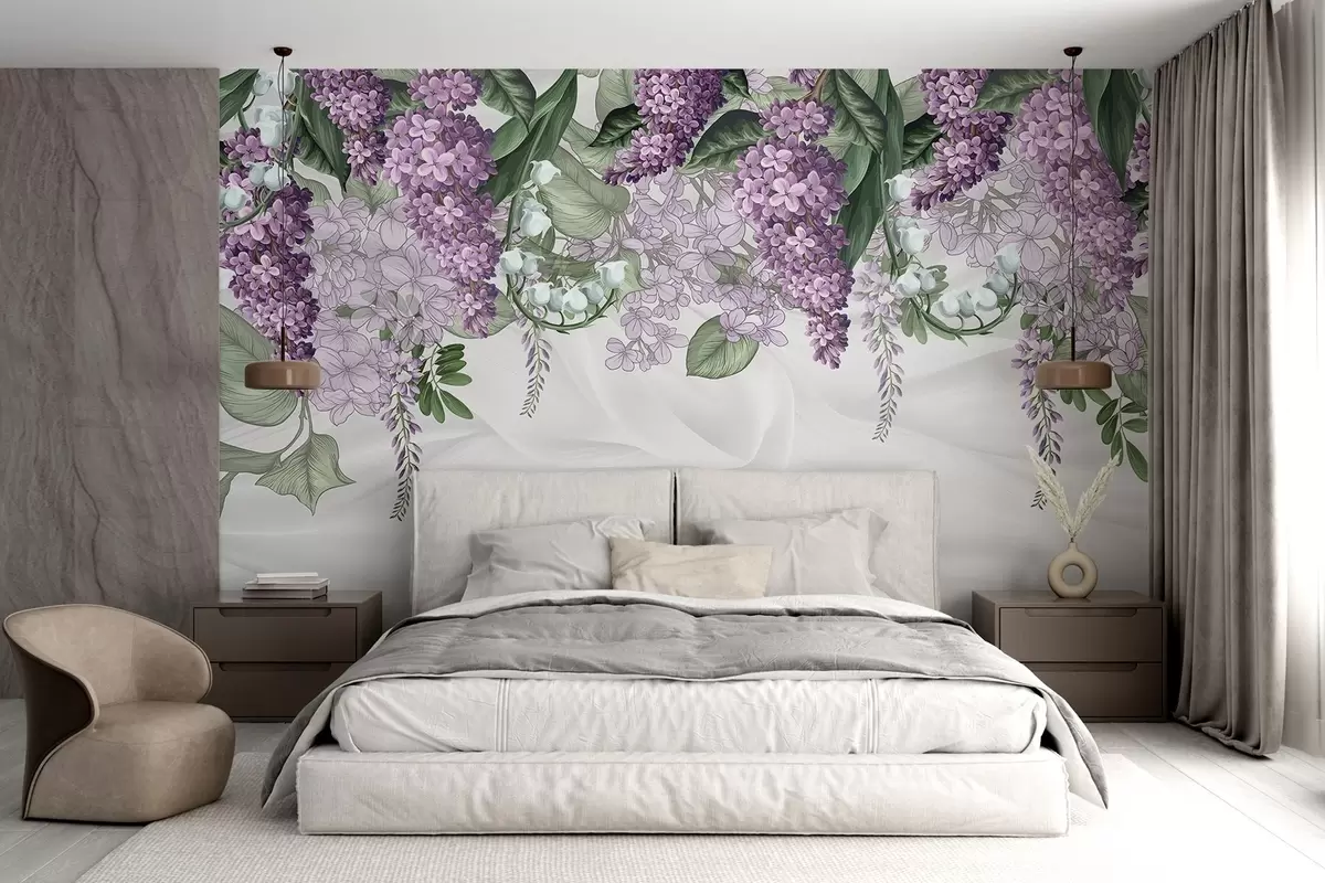 Fototapeten Pastelllila Blumen und grüne Blätter auf weißem Hintergrund mit Kunstseide fabriс Textur N° w08825