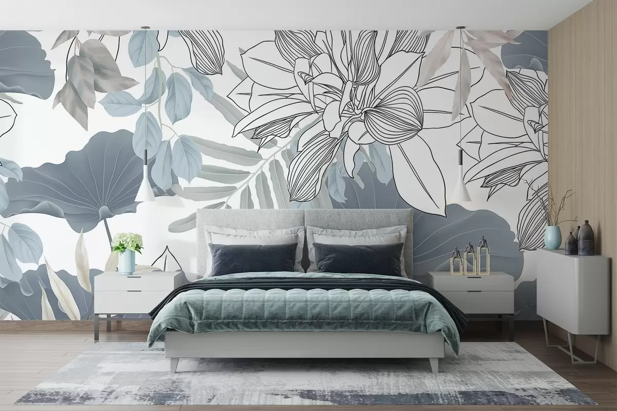 Fototapeten Blumendruck mit Lotosblüten und Blättern in Blau und Weiß auf weißem Hintergrund N° w08827