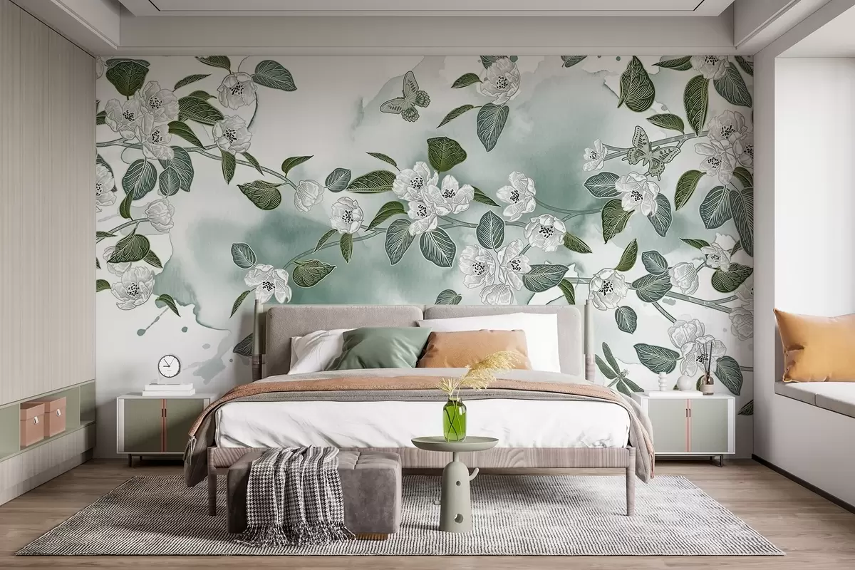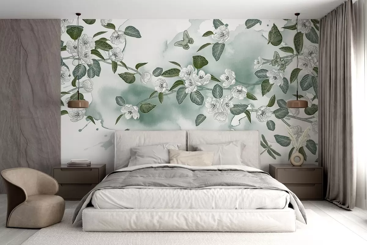 Fototapeten Kirschbaumblüte Zweig mit Blumen, Blätter, Schmetterlinge auf einem hellgrünen Aquarell strukturierten Hintergrund N° w08831