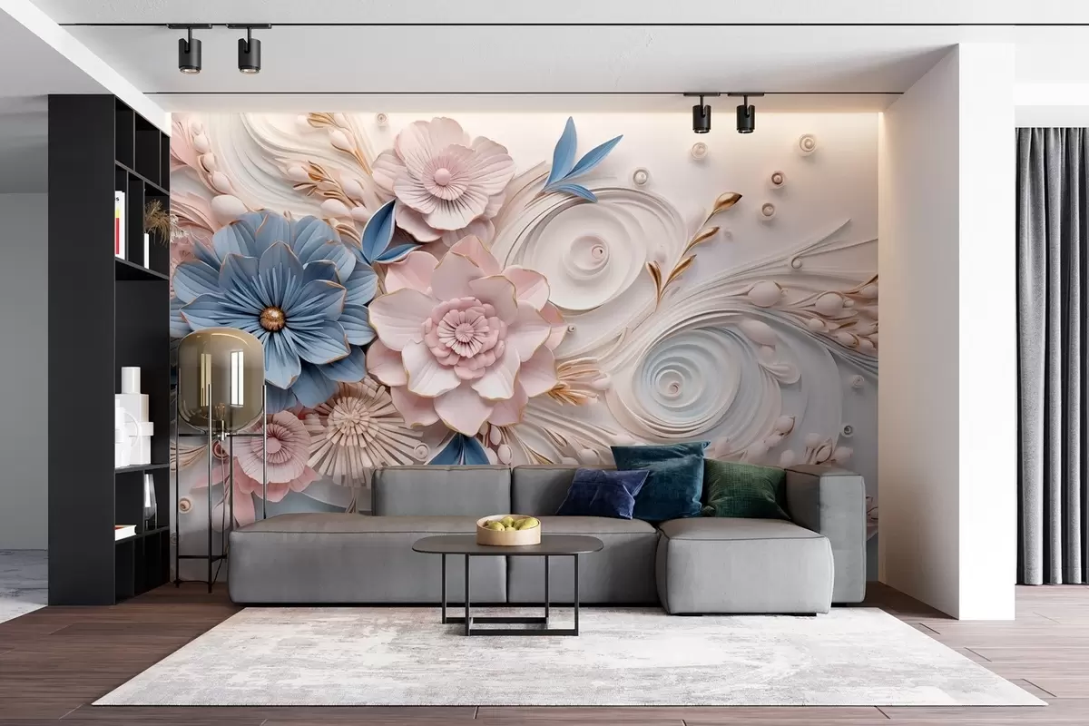 Fototapeten Eine zarte Blumenkomposition in Rosa- und Blautönen mit einem weichen Reliefhintergrund N° w08847