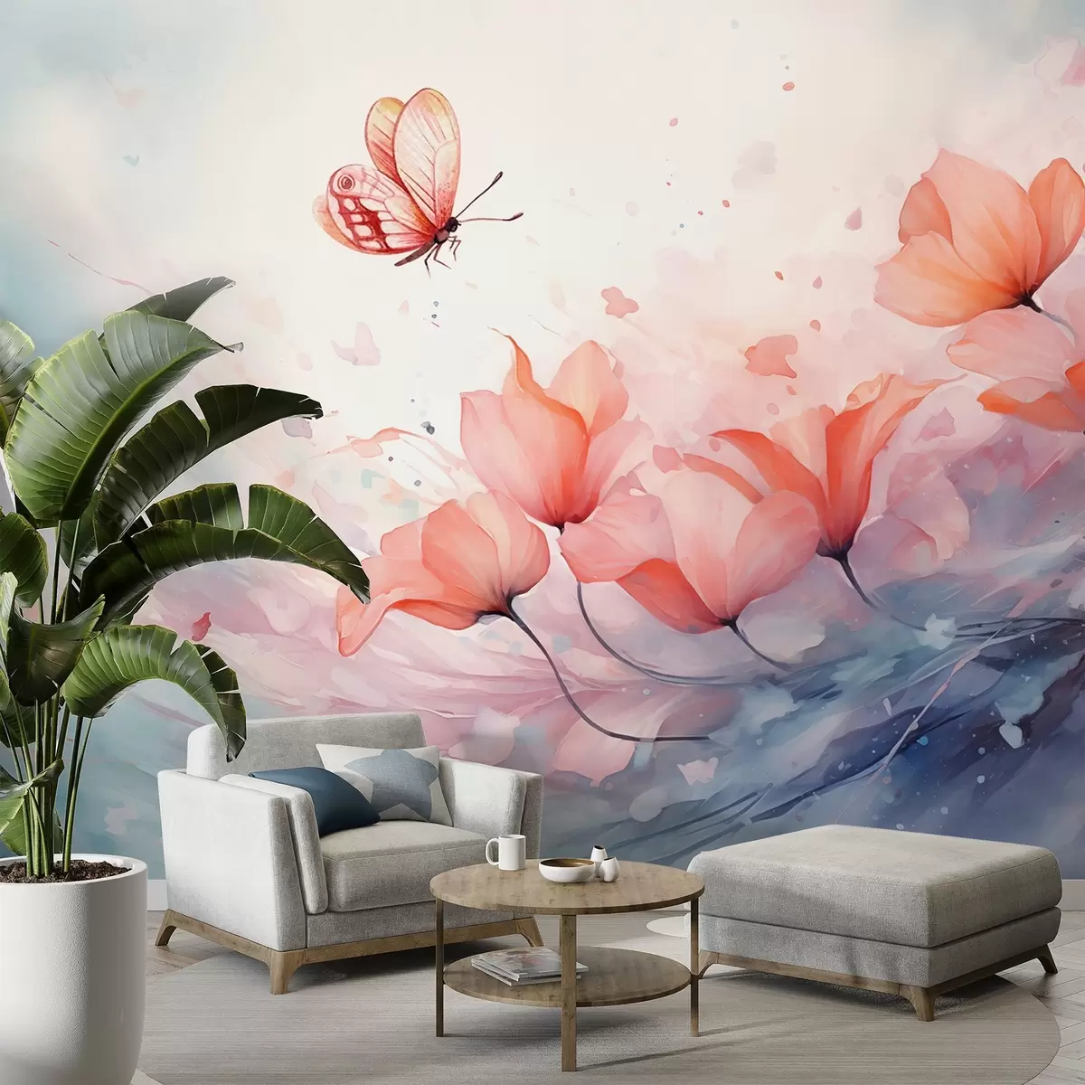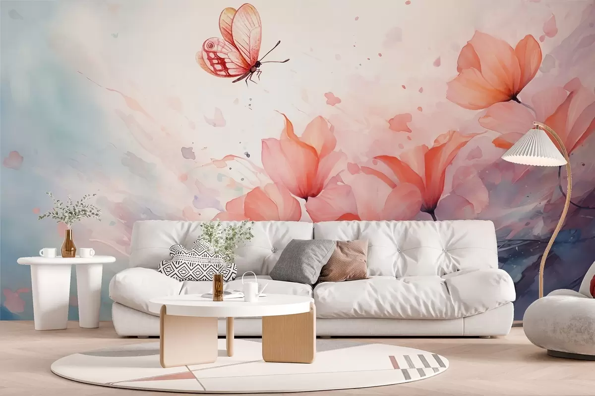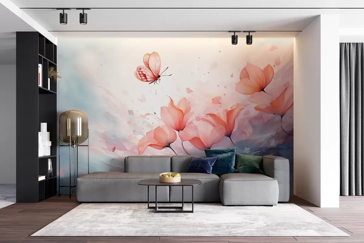 Fototapeten Zarte Mohnblumen mit einem Schmetterling im Aquarellstil N° w08849
