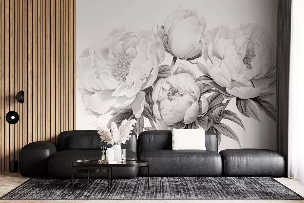 Fototapeten Schwarze und weiße Pfingstrosen im Stil einer Bleistiftzeichnung N° w08852