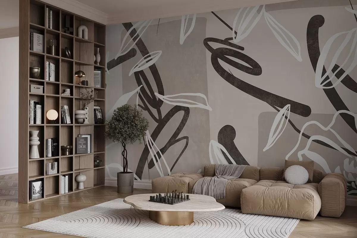 Fototapeten Abstraktes, strukturiertes, modernes und minimalistisches Design mit floralen Elementen in einer neutralen beigen Farbpalette N° w08888