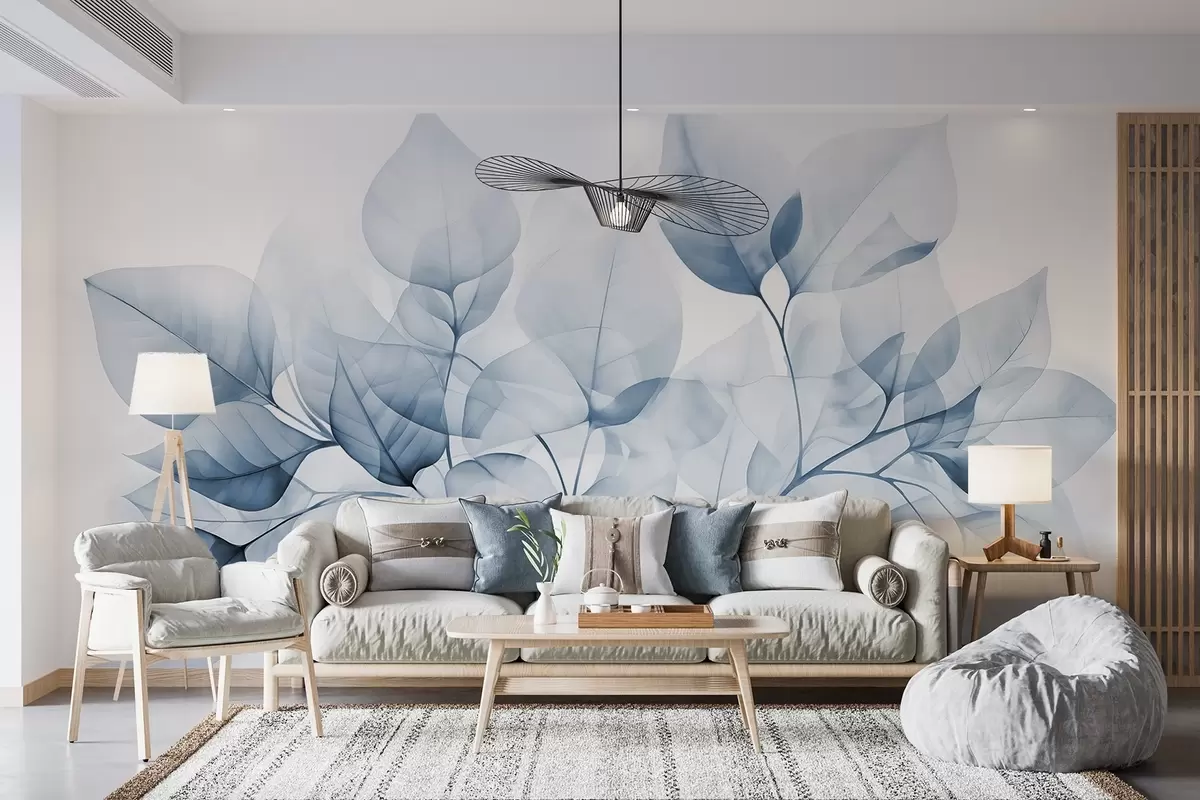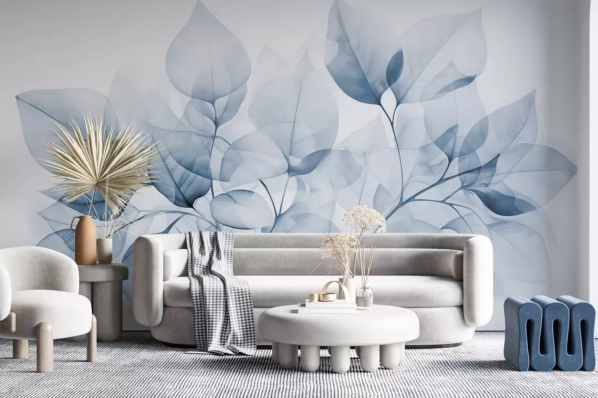 Fototapeten Aquarellmalerei von durchscheinenden Blättern in Pastellfarben, mit Schattierungen von Weiß und Blau N° w08910v1