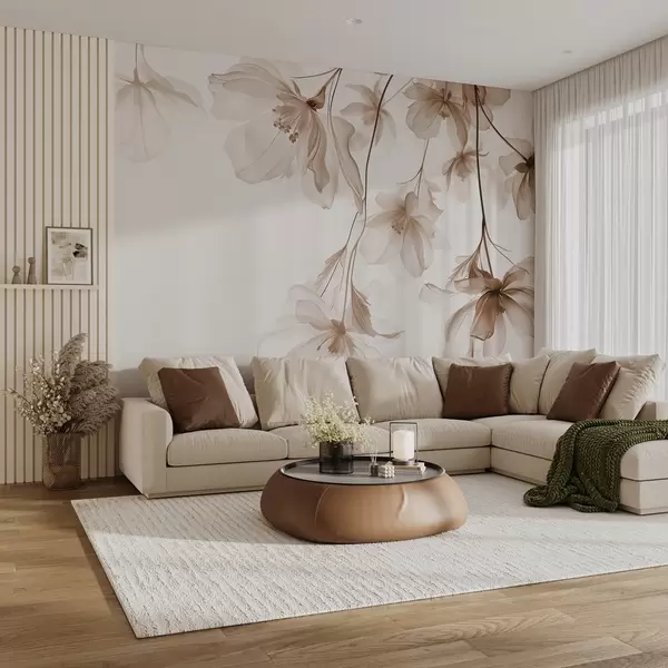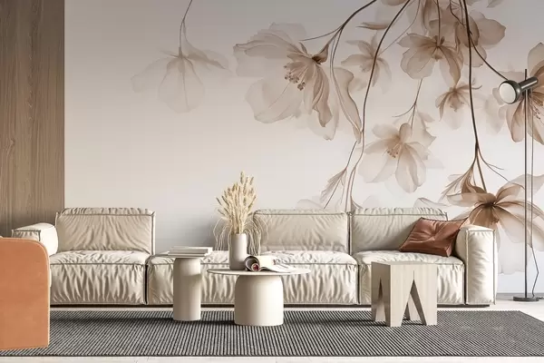 Fototapeten Beige Blumen mit durchscheinenden Blütenblätter hängen von einem Zweig, beige und weiß, minimalistische moderne Kunst Komposition N° w08911v1