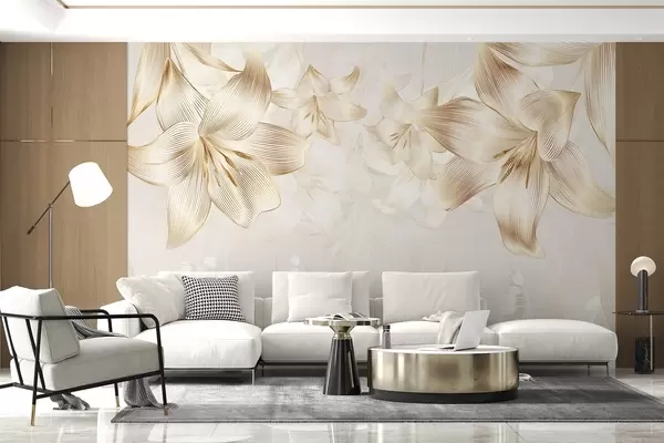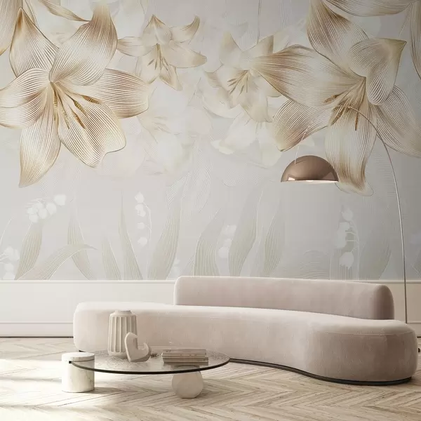 Fototapeten Gelbe Lilien mit filigranen Liniendetails, elegantes Blumenarrangement, neutrale Farbpalette N° w08912