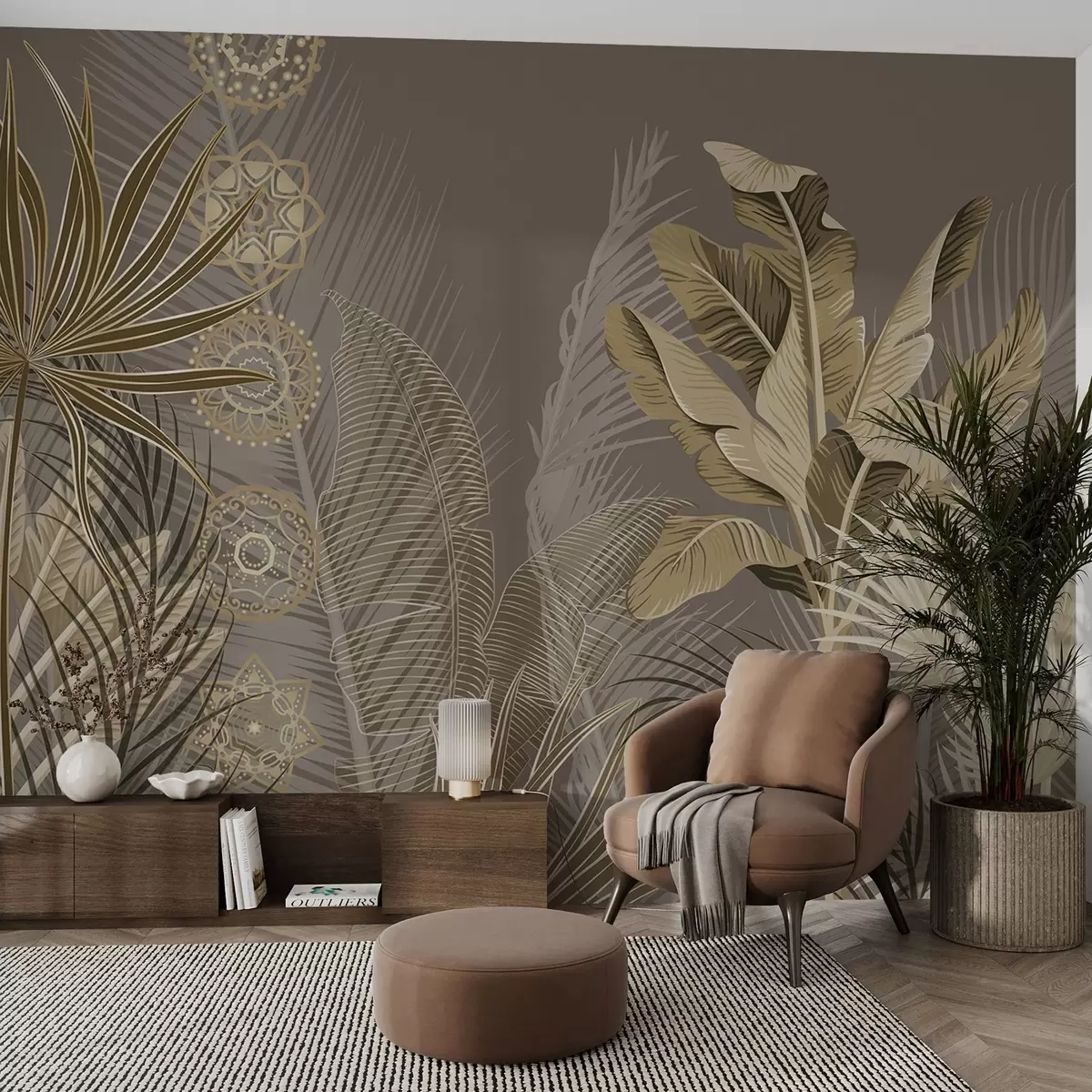 Fototapeten Tropische Blätter in Beige- und Brauntönen, Palmenblätter, Bananenblätter und Mandala-Ornamente, dunkler Hintergrund N° w08913v1
