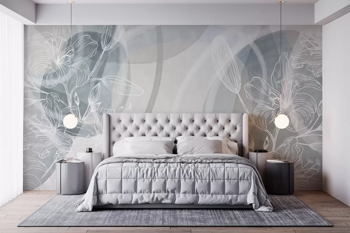 Fototapeten Minimalistisches Blumendesign mit weißen Linienblüten und Blättern, sich überlappende abstrakte Kreise in Grau- und Blautönen N° w08979