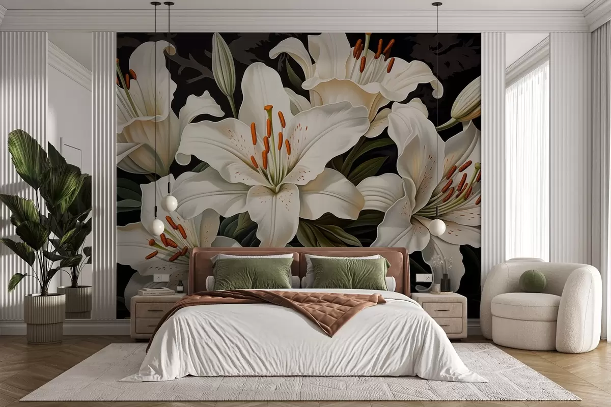 Fototapeten Elegante große weiße Blumen auf dunklem Hintergrund N° w08983