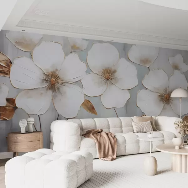 Fototapeten Große weiße Blüten mit gelben Akzentblättern auf grauem Hintergrund N° w08999