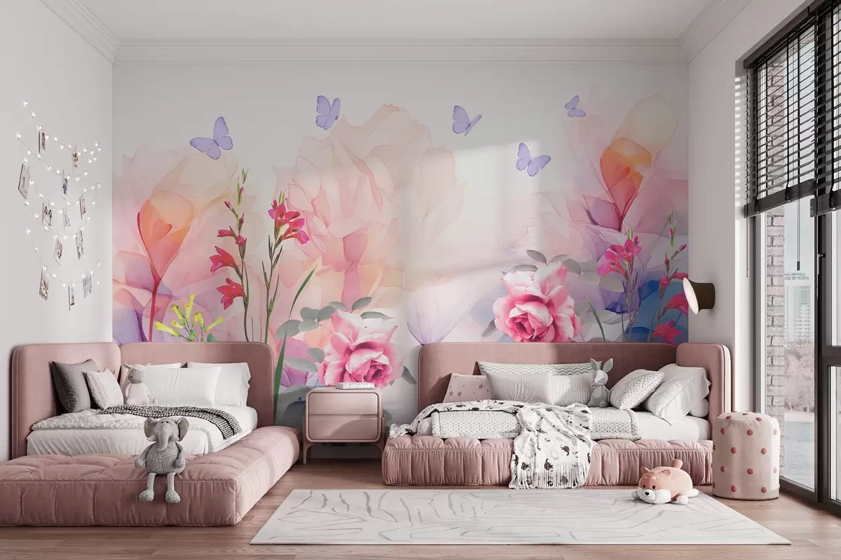 Fototapeten Blumen mit Schmetterlingen und Rosen im Aquarellstil N° w09002