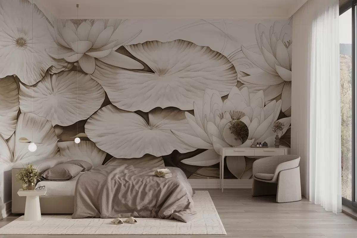 Fototapeten Seerosen und Seerosenblätter in einem Teich, braune und weiße Imitation einer Bleistiftzeichnung, detaillierte botanische Illustration, Naturkunst N° w09006v2