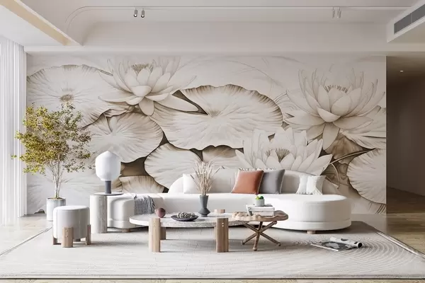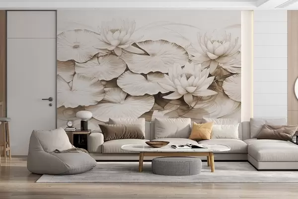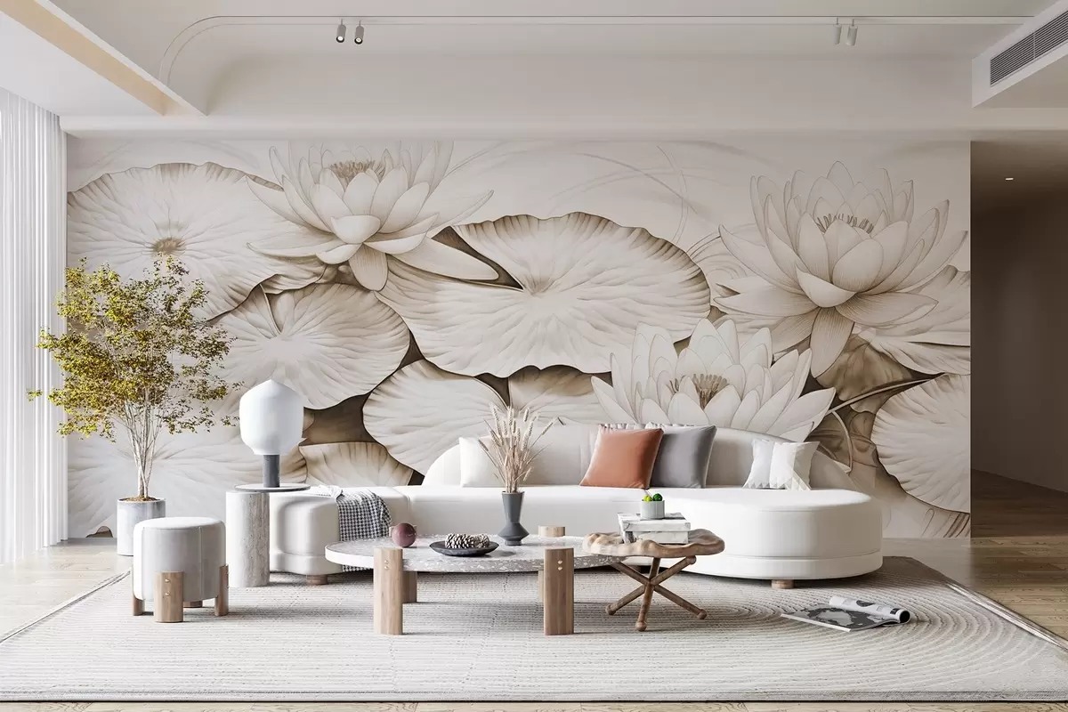 Fototapeten Seerosen und Seerosenblätter in einem Teich, braune und weiße Imitation einer Bleistiftzeichnung, detaillierte botanische Illustration, Naturkunst N° w09006v2