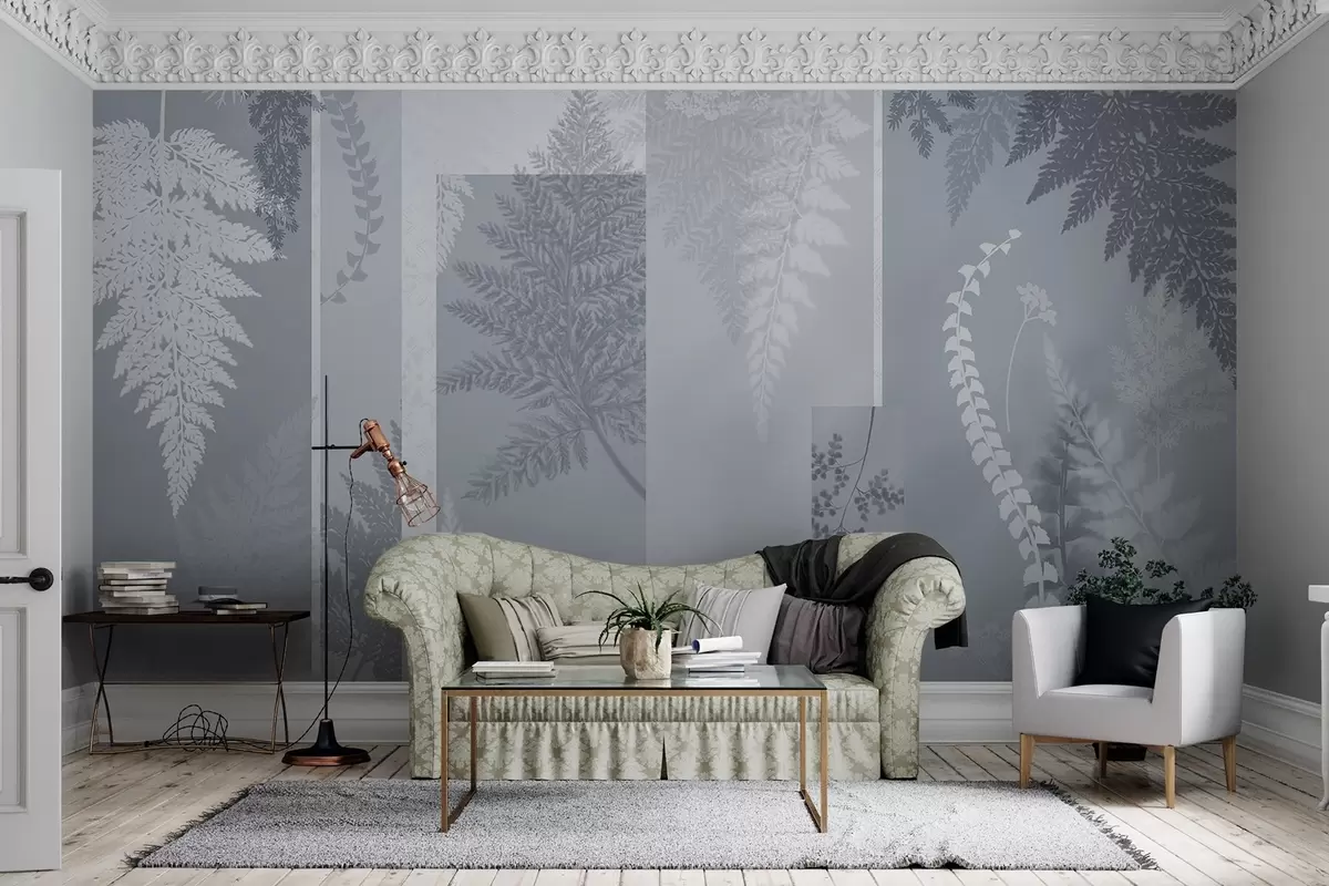 Fototapeten Farnblätter in Blau und Weiß, in vertikalen Streifen angeordnet, wodurch ein botanischer und minimalistischer Druck entsteht, weiche und gedeckte Farben N° w09007v1