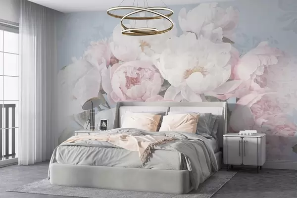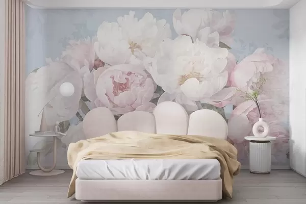 Fototapeten Texturierte abstrakte rosa und weißen Pfingstrosen mit grünen Blättern, hellblauem Hintergrund, weichen und zarten Farben, Vintage-Stil N° w09008