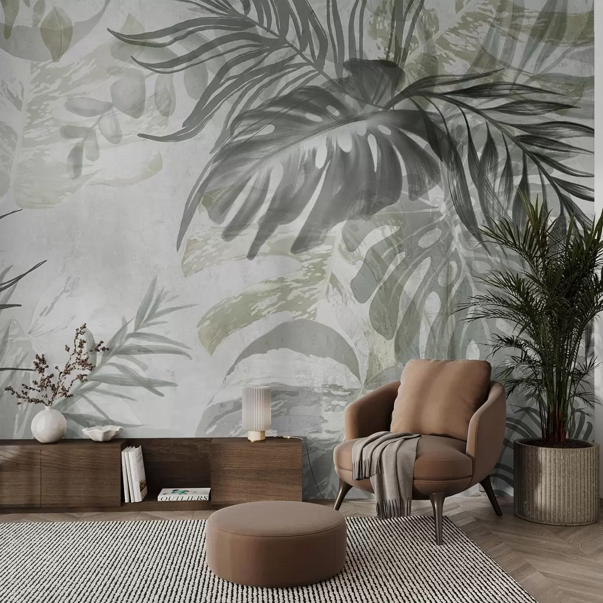 Fototapeten Monstera und Palmenblätter in Grün- und Grautönen, botanisch, tropisches Laub, Dschungelpflanzen, strukturierter Hintergrund N° w09011