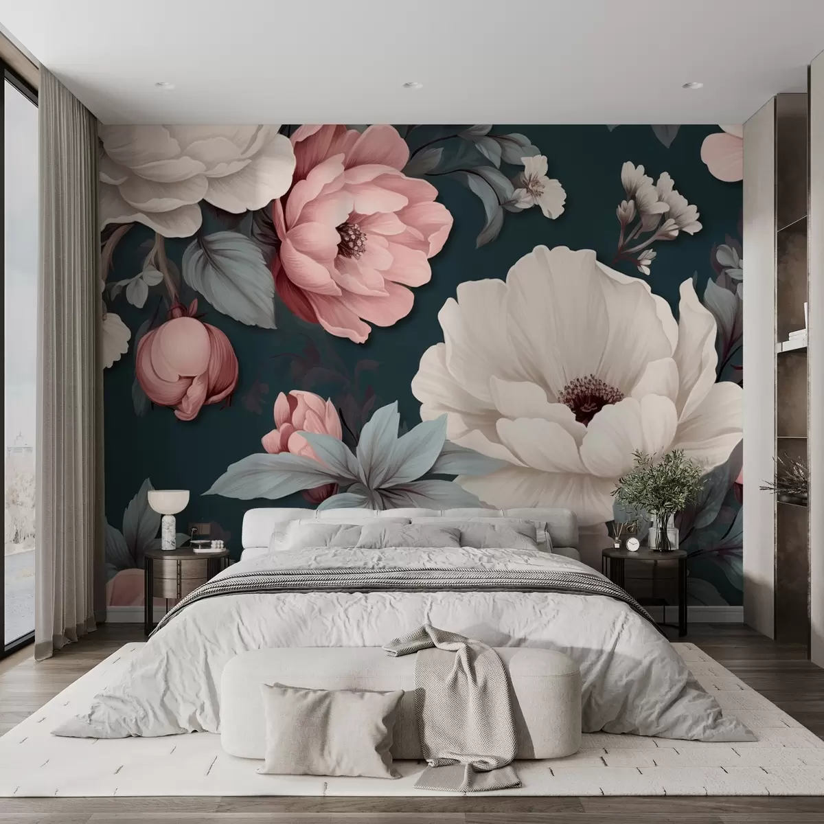 Fototapeten Weiße und rosa Pfingstrosen auf einem dunkelblauen Hintergrund N° w09017