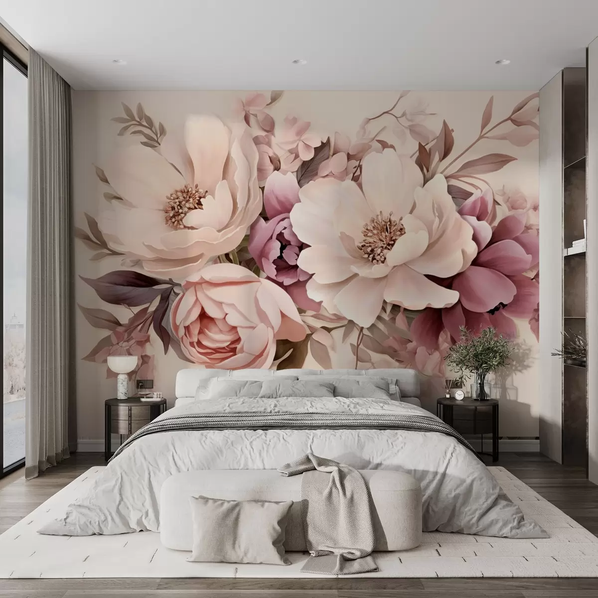 Fototapeten Zarte Komposition aus rosa und beigen Blumen, Pfingstrosen mit Blättern N° w09019