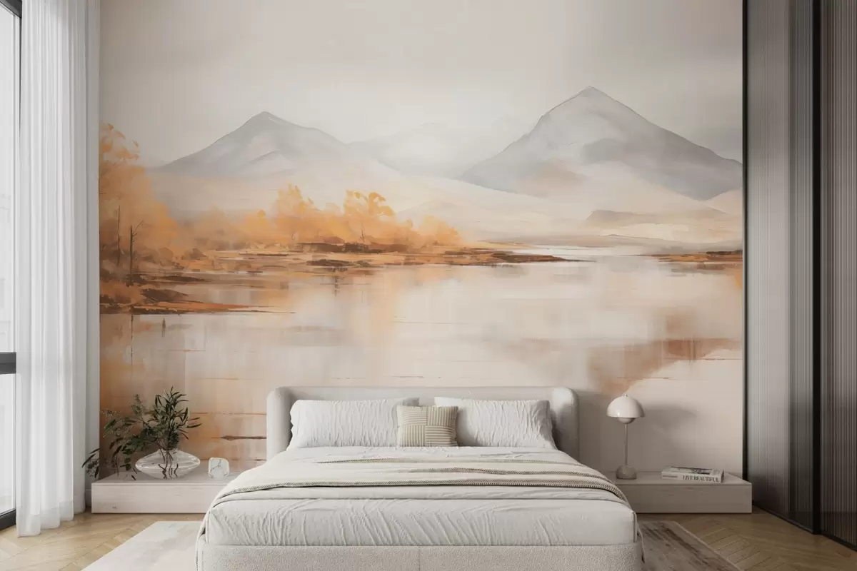 Fototapeten Herbstlandschaft mit gelben Bäumen und einem Fluss vor einem Berghintergrund N° w09020
