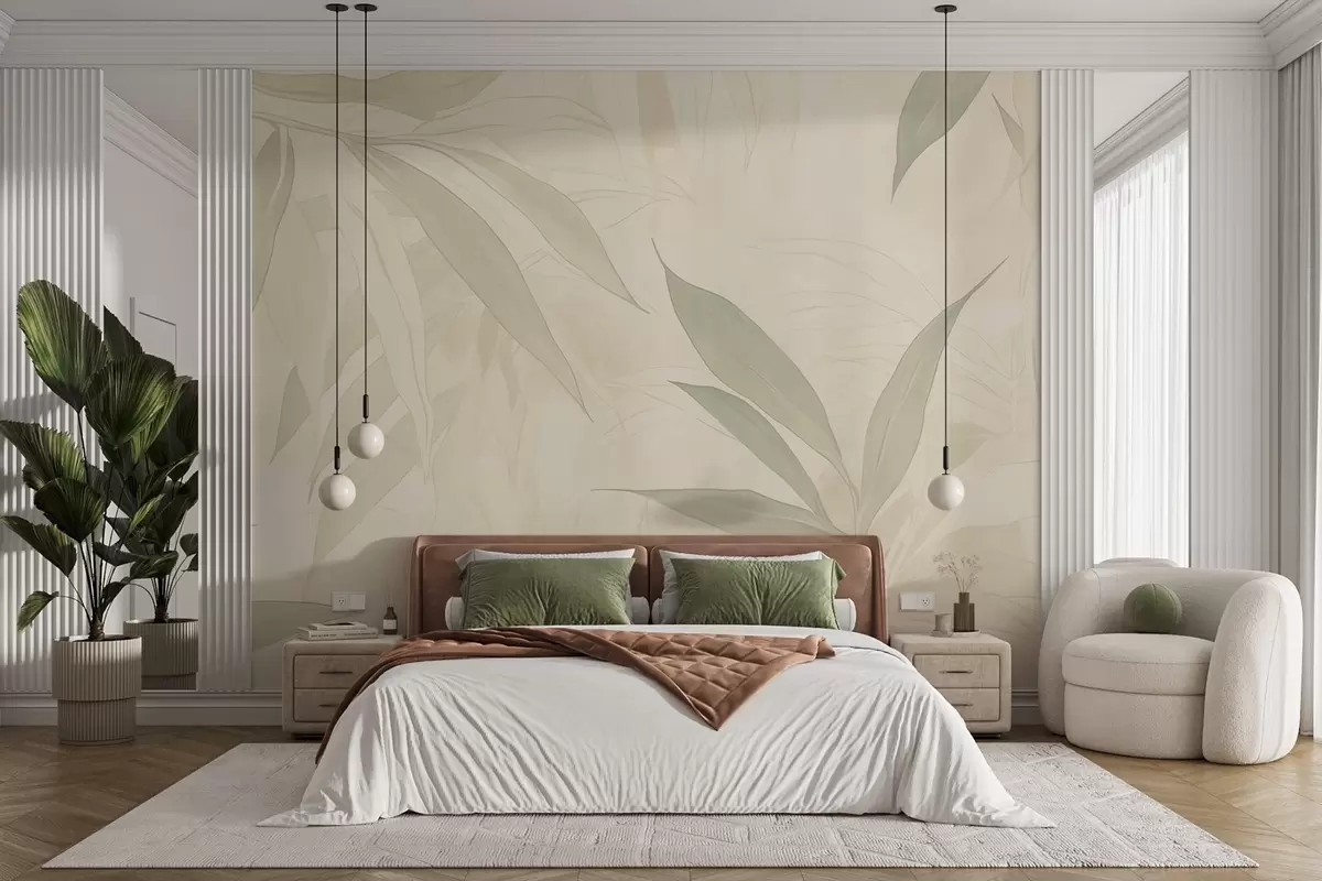 Fototapeten Zweige mit Blättern in sanften Grüntönen auf beigem Hintergrund N° w09027