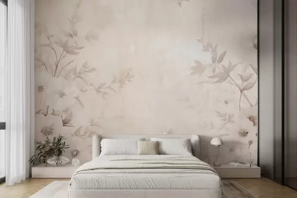 Fototapeten Blumen mit Blättern in neutralen hellen Tönen im Aquarellstil N° w09040