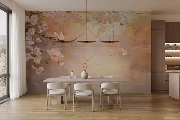 Fototapeten Abstrakte Landschaft Kunst mit Blüte Zweig und weißen Blumen hängen über einem See, weiche Pastellfarben N° w09046