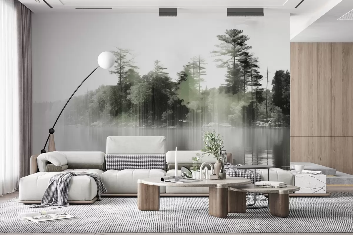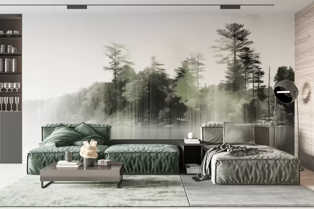 Fototapeten Abstrakter Minimalismus texturierte Landschaft mit einem See und Bäume Reflexionen im Wasser in grünen und weißen Farbtönen N° w09058