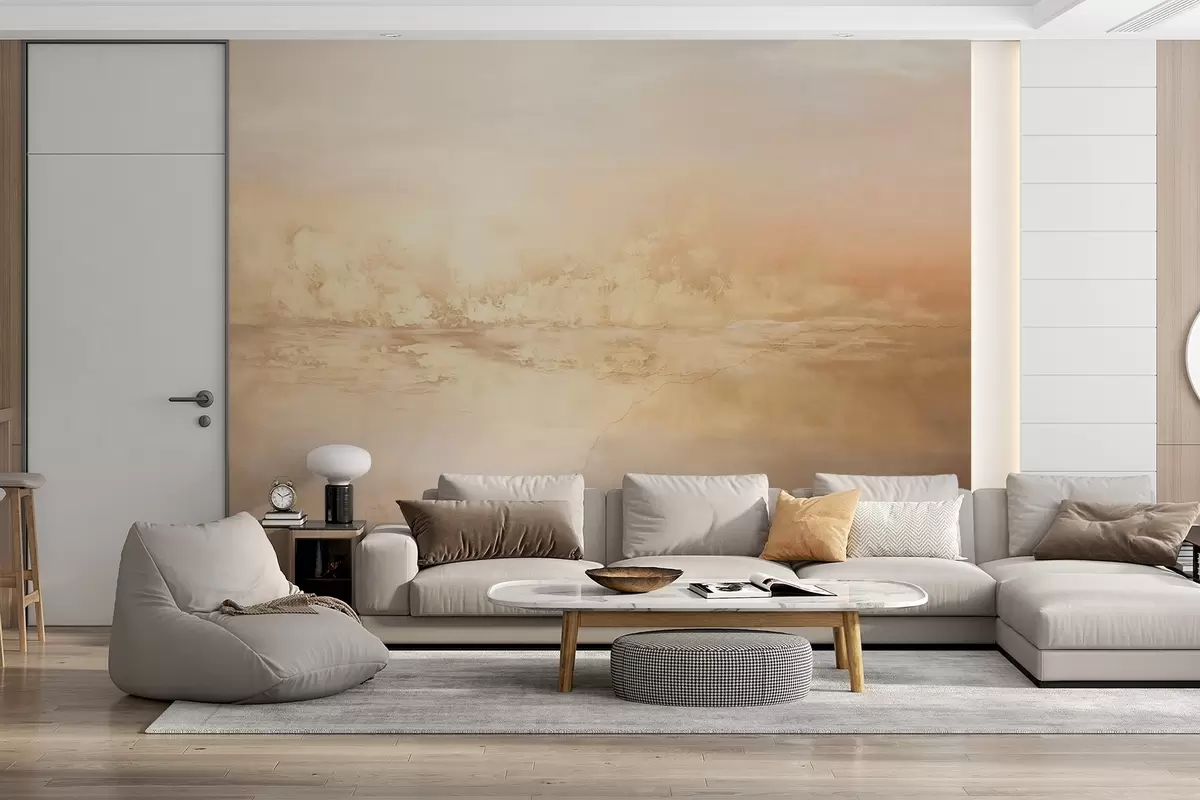Fototapeten Abstrakte, strukturierte Landschaft mit warmen Farben, einer weichen und verträumten Atmosphäre und einer Mischung aus orangen, gelben und weißen Farbtönen N° w09063