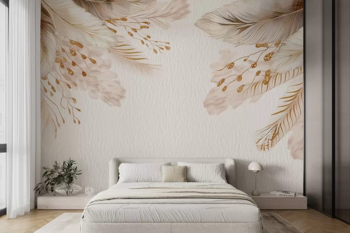 Fototapeten Pampasgras und Federn im Aquarellstil in Beige und Weiß auf Papier N° w09079