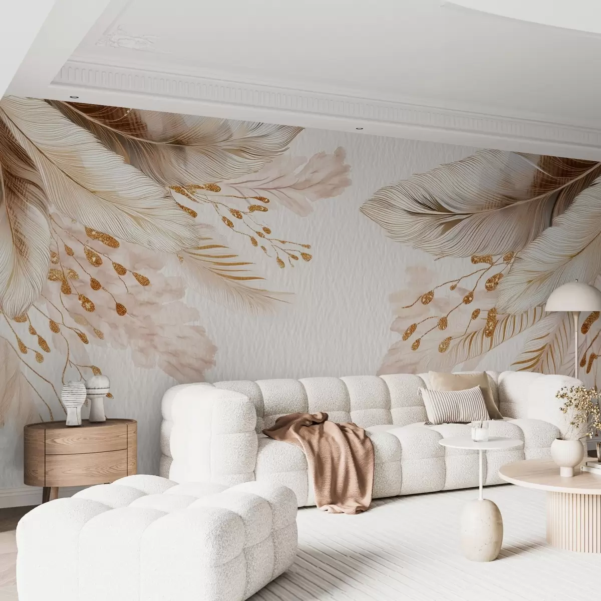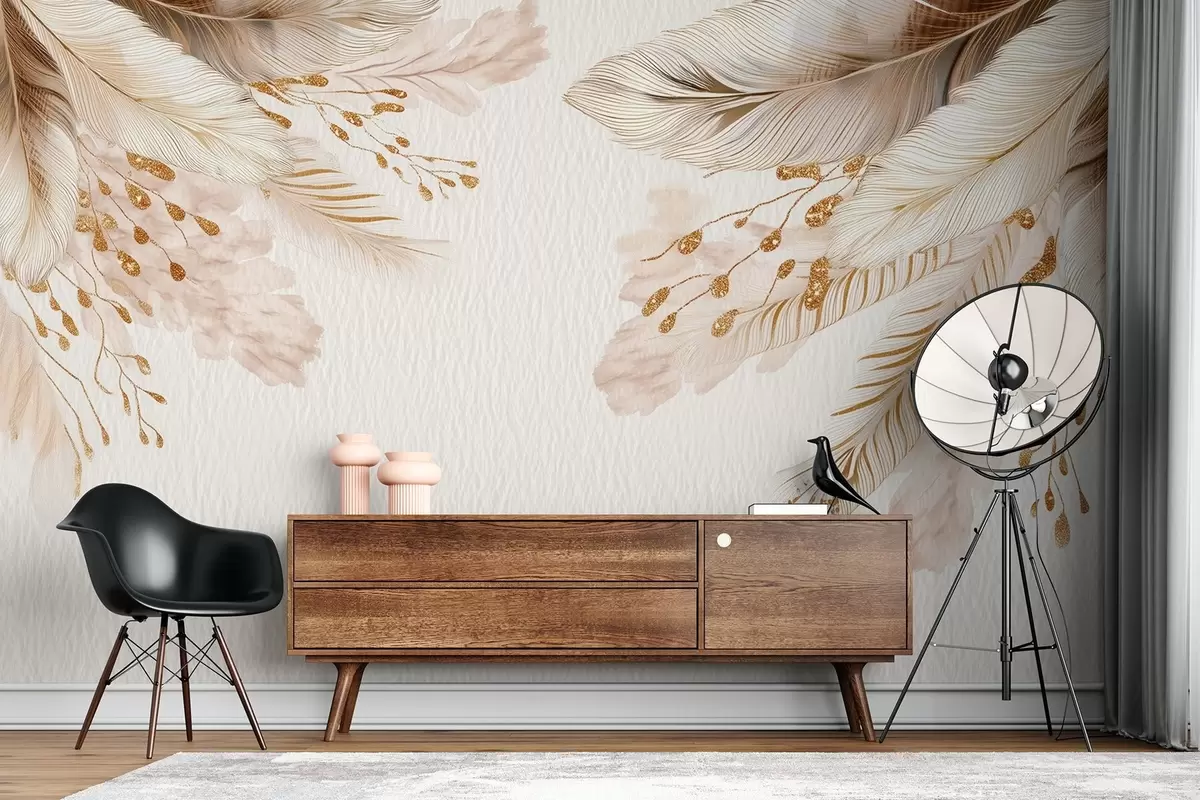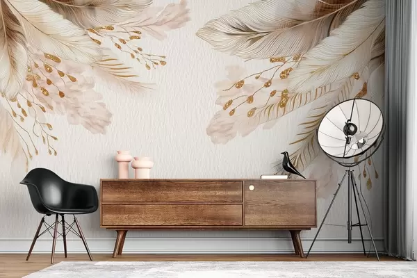 Fototapeten Pampasgras und Federn im Aquarellstil in Beige und Weiß auf Papier N° w09079