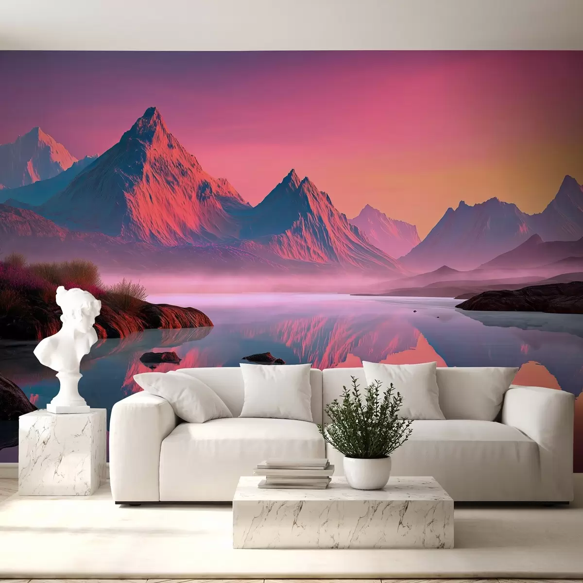 Fototapeten Romantischer Sonnenuntergang Landschaft mit einem Fluss und Berge in rosa Schattierungen N° w09093