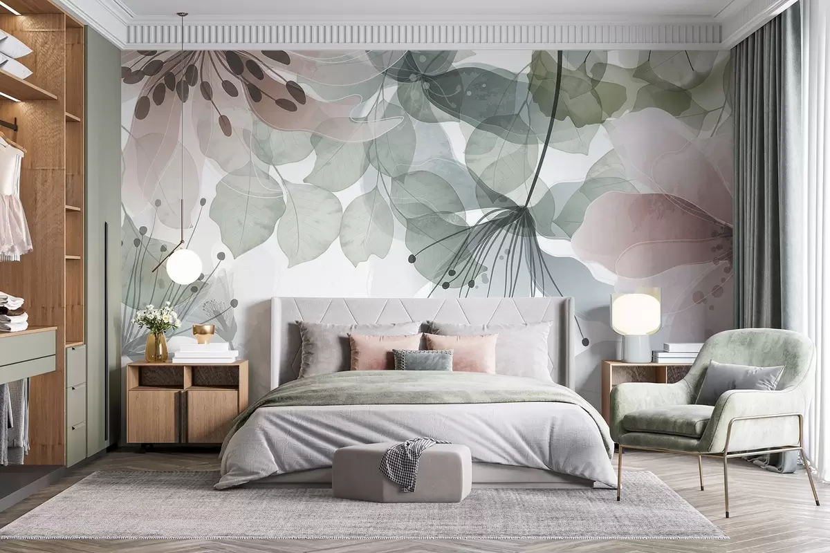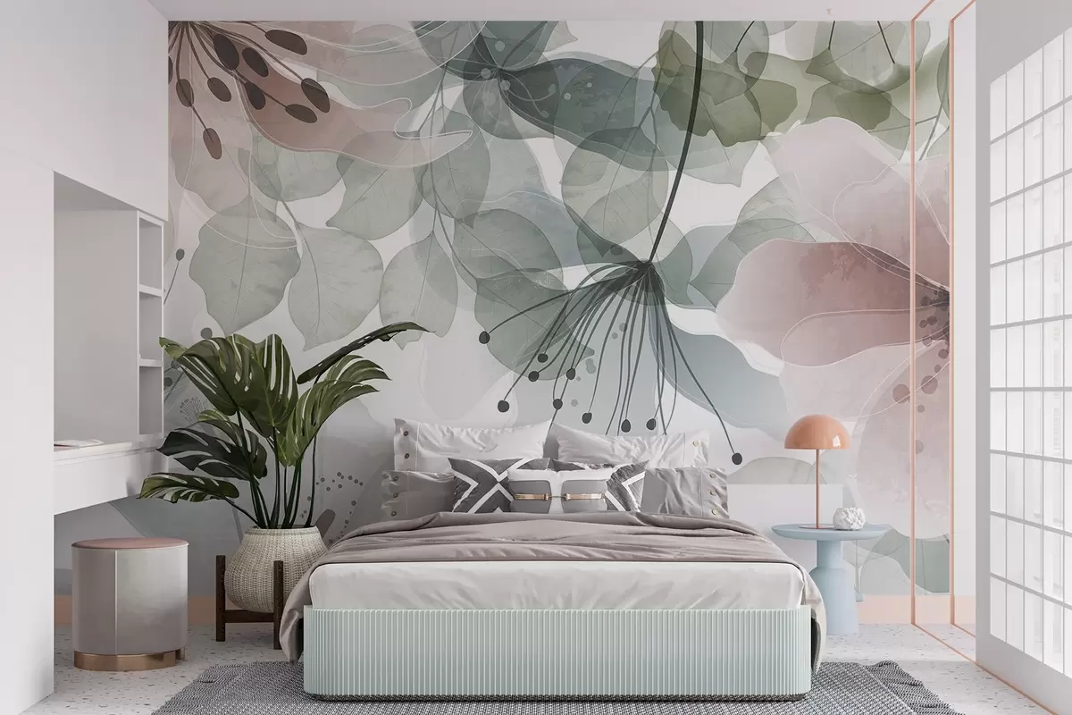 Fototapeten Blumen und Blätter in Pastellfarben, durchscheinende Blütenblätter und Blätter, weicher Aquarelleffekt, zarte Linien, weißer Hintergrund N° w09107