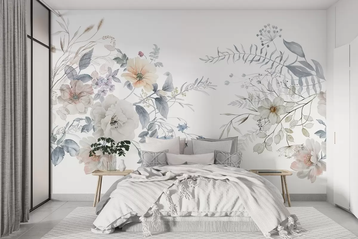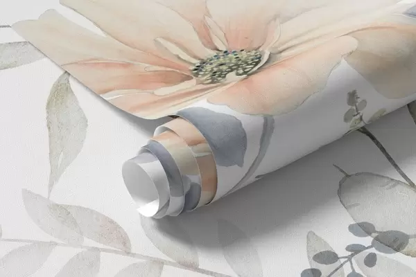 Fototapeten Blumenarrangement im Stil der Aquarellmalerei mit weißen, pfirsichfarbenen und blauen Blumen, zartes Grün auf weißem Hintergrund N° w09108
