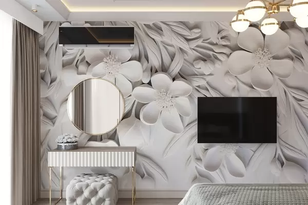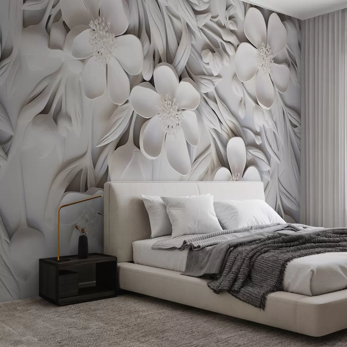 Fototapete Weiße Blumen und Blätter in einem weißen Hintergrund, floral elegant, dekoratives Design, komplizierte Details w09113